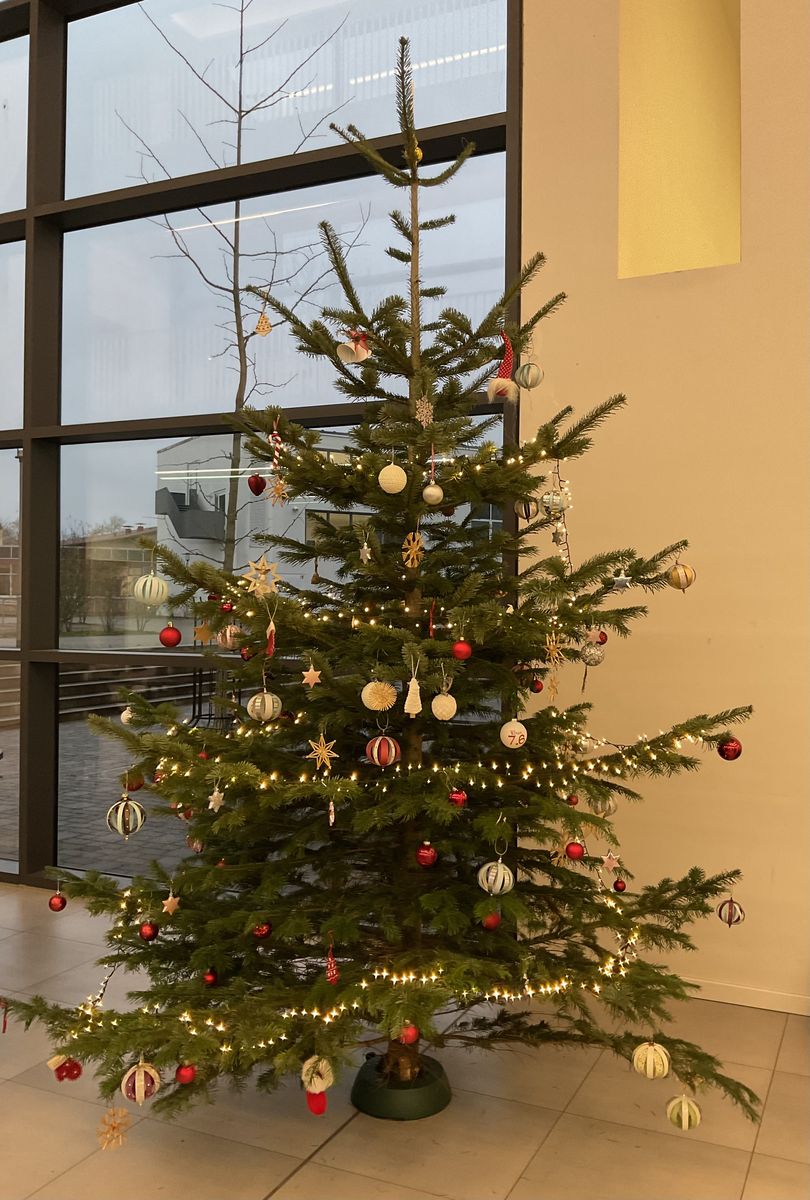Zwei große Weihnachtsbäume bringen in der Adventszeit unsere Foyers im Schulgebäude und in der Aula zum Strahlen.